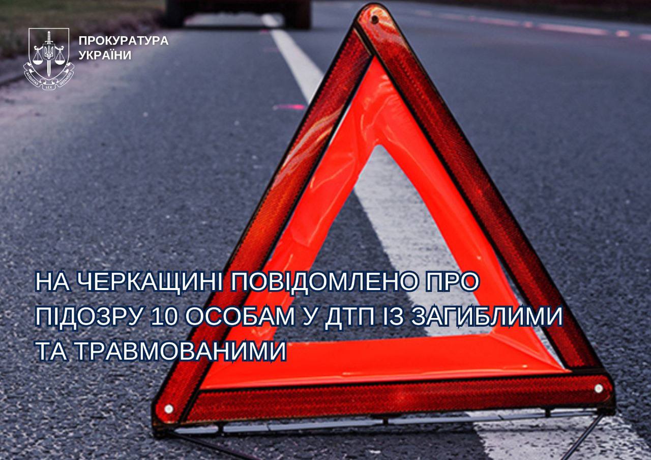 За процесуального керівництва прокурорів Черкаської обласної прокуратури та окружних прокуратур області повідомлено про підозру 10 особам у порушенні правил безпеки дорожнього руху, що спричинили смерть потерпілих або заподіяли тяжкі тілесні ушкодження. Встановлено, що підозрювані, керуючи транспортними засобами, грубо порушували вимоги Правил дорожнього руху, внаслідок чого сталися дорожньо-транспортні пригоди: Умань Водій автомобіля «Renault», виїжджаючи на автодорогу,...