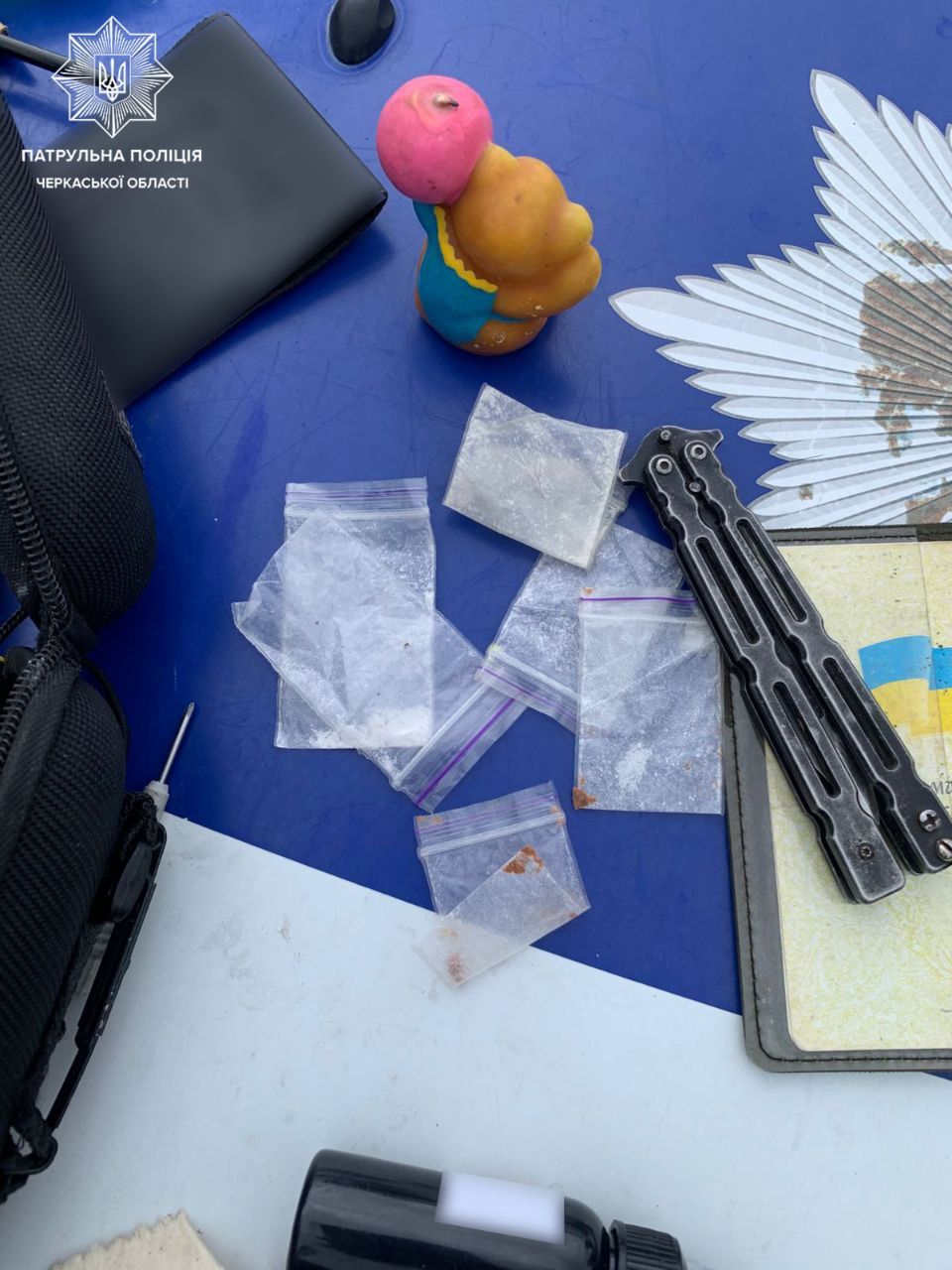 Вихідними, патрулюючи на проспекті Хіміків у Черкасах, патрульні помітили особу, яка побачивши поліцейських почала помітно нервувати та намагалася уникнути зустрічі. При розмові чоловік повідомив, що має із собою наркотичні речовини. Провівши поверхневу перевірку, поліцейські виявили 6 пакетиків із, ймовірно, наркотичними речовинами та пристрої для їх вживання. Знайдені речовини були вилучені та направлені на експертизу, на...