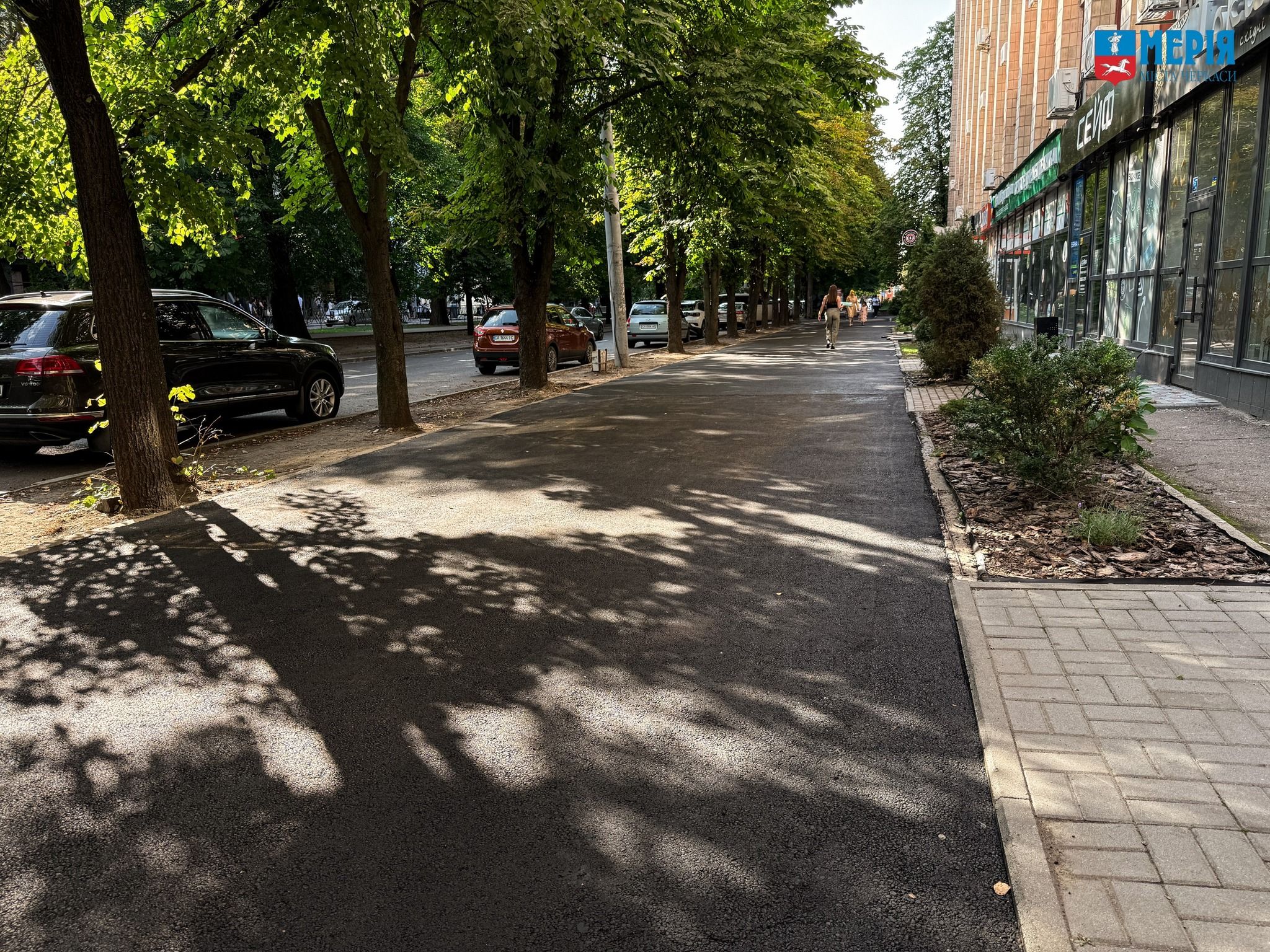 У Черкасах триває улаштування нового асфальтобетонного покриття на тротуарі вздовж бульвару Шевченка. Роботи виконує КП «ЧЕЛУАШ» на ділянці від вулиці Байди Вишневецького до вулиці Святотроїцької. Наразі працівники підприємства проводять очищення основи, оброблення поверхні емульсією, укладання асфальтобетонної суміші з подальшим ущільненням віброкатом. До робіт залучено техніку - вібраційний каток та автомобіль КДМ для транспортування асфальтобетону.