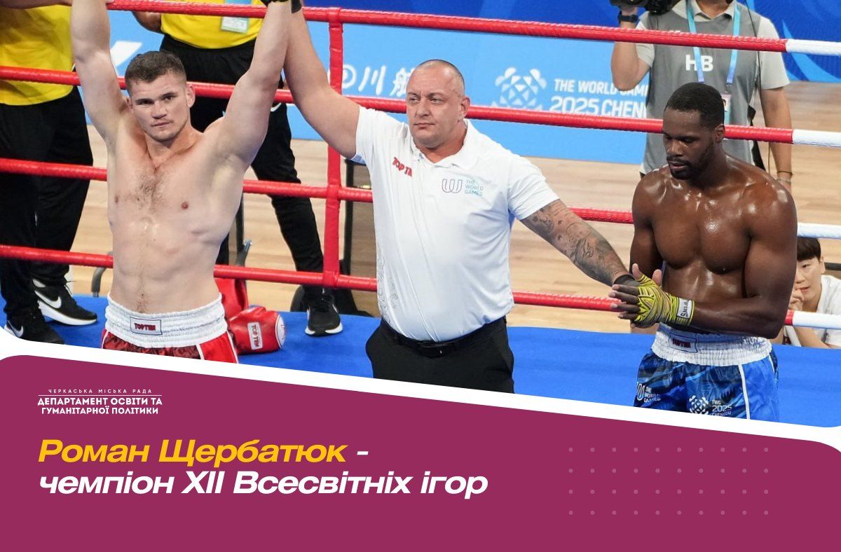 Заслужений майстер спорту України Роман Щербатюк здобув золото в кікбоксингу WAKO, К-1 (вагова категорія +91кг) у XII Всесвітніх іграх у м. Ченду (Китай), інформує Черкаський спорт. У чвертьфіналі черкащанин впевнено переміг суперника з Єгипту, двічі відправивши того у нокдаун. У півфіналі, знову двічі відправивши в нокдаун вже французького кікбоксера, вийшов у фінал. У головному поєдинку...