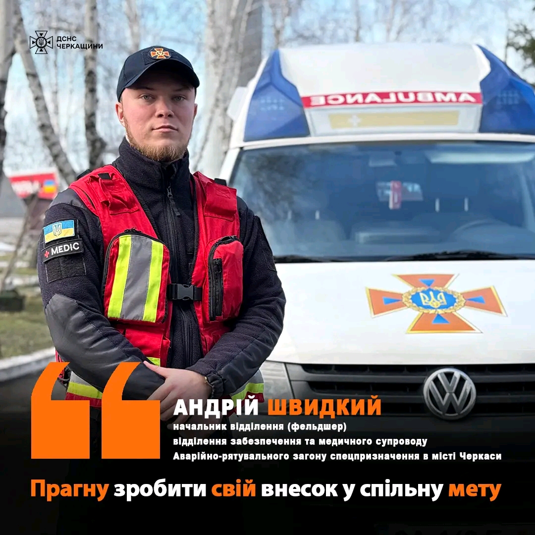 Андрій Швидкий — начальник відділення (фельдшер) відділення забезпечення та медичного супроводу Аварійно-рятувального загону спецпризначення в місті Черкаси. Кілька років тому Андрій не міг собі й уявити, що служитиме у ДСНС. Він закінчив Черкаську медичну академію та планував виїхати за кордон, продовжити навчання і там будувати медичну кар'єру. Коли почалася повномасштабна війна, він зрозумів, що повинен...