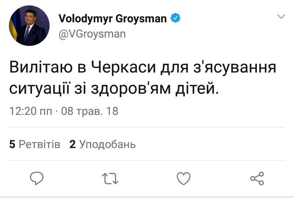До Черкас терміново вилетів Прем'єр - міністр України Володимир Гройсман, про це він повідомив на своїй офіційній сторінці в twitter. Нагальність поїздки високопосадовець пояснив необхідністю з'ясування обставин, які призвели до отруєння 42 дітей у загально-освітній школі № 8. Нагадаємо, сьогодні вранці з невідомих причин, під час лінійки втратило свідомість близько півсотні дітей. Рятувальні та медичні...
