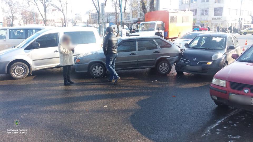 Сьогодні на перехресті вулиць Благовісної та Смілянської сталось потрійне ДТП, повідомляє Патрульна поліція Черкаської області. Водій автомобіля Nisan не вибрав безпечної дистанції та швидкості руху, скоїв зіткнення з авто ВАЗ-2114, який, внаслідок удару, в’їхав у Volkswagen. Учасники автопригоди не постраждали. На винуватця патрульні поліцейські склали адміністративний протокол за ст. 124.