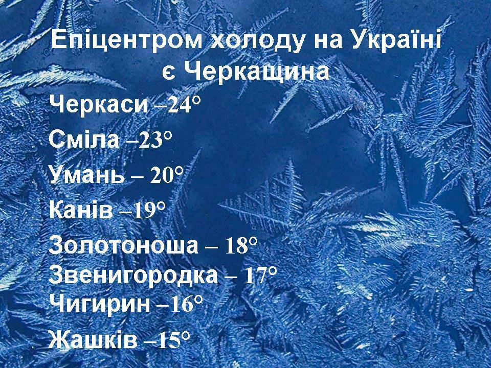 Епіцентром холоду в Україні є Черкаська область. Про це повідомили в обласному центрі з гідрометеорології. За інформацією синоптиків, сьогодні вночі в Черкасах фіксували -24º, у Смілі -23º, в Умані -20º морозу, пише "Рідна Черкащина". Відсьогодні атмосфера почне поступово перебудовуватися за західний атмосферний процес, що обіцяє загальне послаблення морозів та збільшення хмарності. Сонячна морозна та тиха...