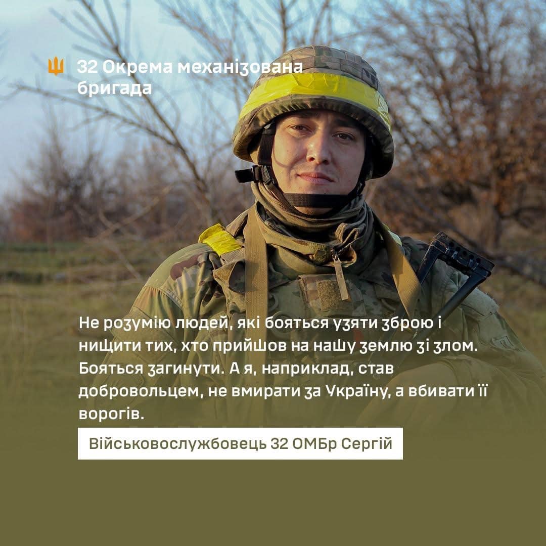 Черкащанин Сергій воює на фронті вже два роки. Він є військовослужбовцем 32-ої ОМБр. Каже, пішов в армію добровільно не для того щоб загинути за країну, а щоб нищити ворога. Сергій служить навідником зенітного кулеметного взводу. "Мій дід із Закавказзя, але тато народився тут і був справжнім українцем. Я 1994 року народження, тобто виріс у незалежній...