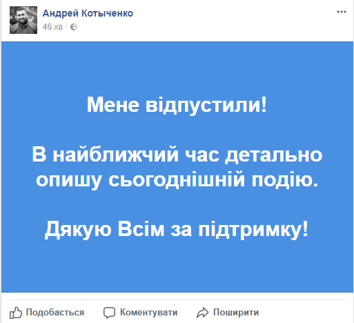 Черкаського активіста Андрія Котиченка, який був затриманий через прорив Саакашвілі, відпустили. Про це сам активіст повідомив на власній сторінці у Фейсбук. Він подякував всім за підтримку і в найближчий час пообіцяв детально описати сьогоднішню подію. Нагадаємо, Андрій Котиченко був заарештований сьогодні, 12 вересня. Котиченко був безпосередньо серед тих, хто заводив Саакашвілі до України.