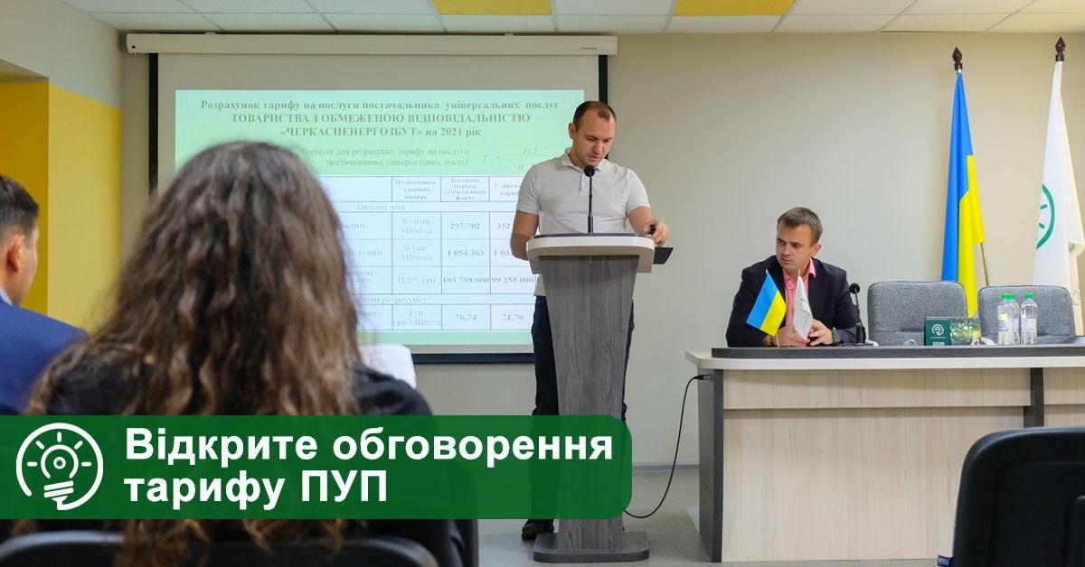 Відкрите обговорення питання щодо встановлення тарифу на універсальні послуги ТОВ «Черкасиенергозбут» на 2021 рік відбулося 28 вересня. Зазначимо, що такі обговорення відбуваються щороку на виконання Постанови Національної комісії, що здійснює державне регулювання у сферах енергетики та комунальних послуг № 866 від 30.06.2017 «Про затвердження Порядку проведення відкритого обговорення проектів рішень Національної комісії, що здійснює державне регулювання...