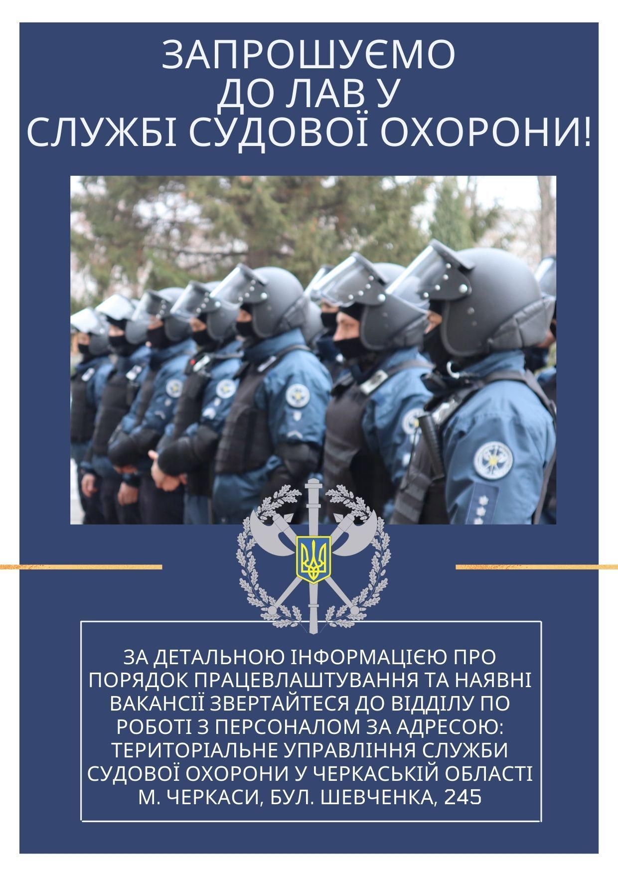 Територіальне управління Служби судової охорони у Черкаській області оголошує конкурс на зайняття вакантних посад. З дислокацією у Черкасах: провідний спеціаліст (оперативний черговий) відділу оперативно-чергової служби – 1 посада; командир 1 відділення 1 взводу охорони 1 підрозділу охорони – 1 посада; командир 2 відділення 1 взводу охорони 1 підрозділу охорони – 1 посада; контролер І категорії...