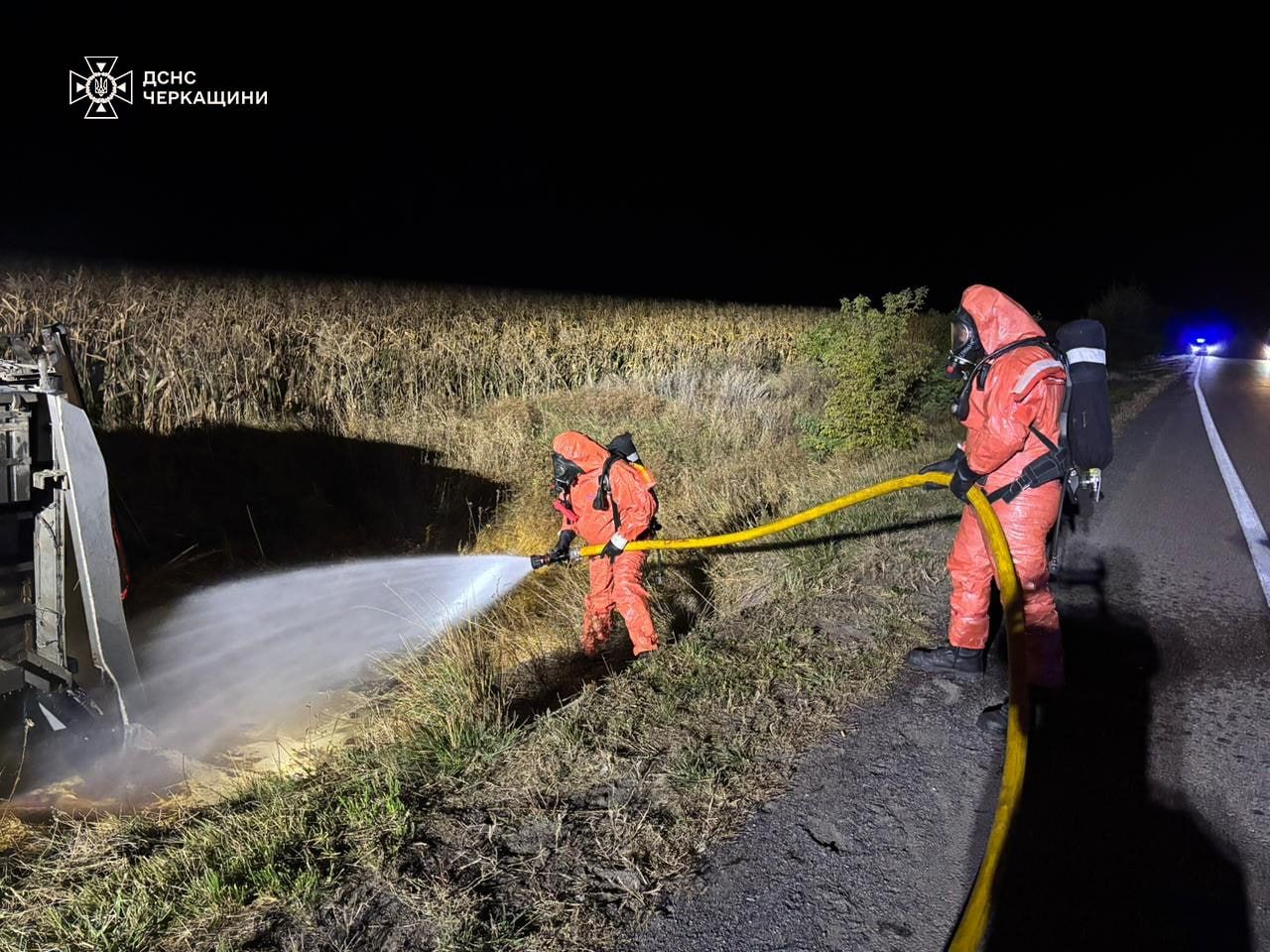 На Уманщині рятувальники ліквідували наслідки ДТП з розливом хімічної речовини. Пригода за участю вантажного автомобіля DAF сталася сьогодні, 26 вересня, поблизу села Бабанка. Унаслідок аварії транспортний засіб перекинувся, що призвело до розливу близько 13 тонн рідкої хлоровмісної речовини. Фахівці групи радіаційного, хімічного та біологічного захисту провели заміри в радіусі 100 метрів — перевищень гранично допустимих...
