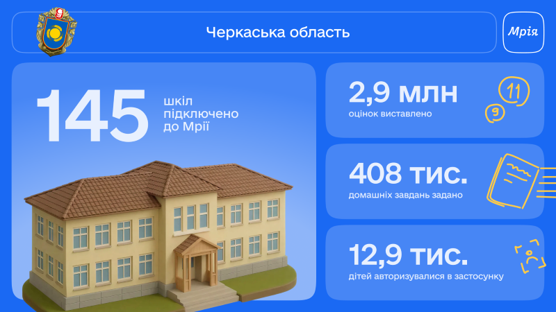 За час роботи з Мрією вчителі області виставили майже 3 млн оцінок та задали понад 408 тис. домашніх завдань. Близько 13 тис. дітей уже авторизувалися в застосунку та регулярно користуються ним.