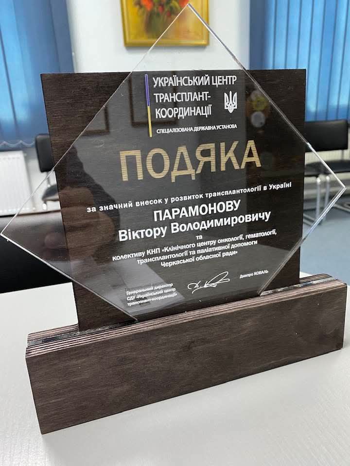 Директор Черкаського клінічного онкоцентру Віктор Парамонов разом із командою закладу отримали подяку Українського центру трансплант-координації — за значний внесок у розвиток трансплантології в Україні.