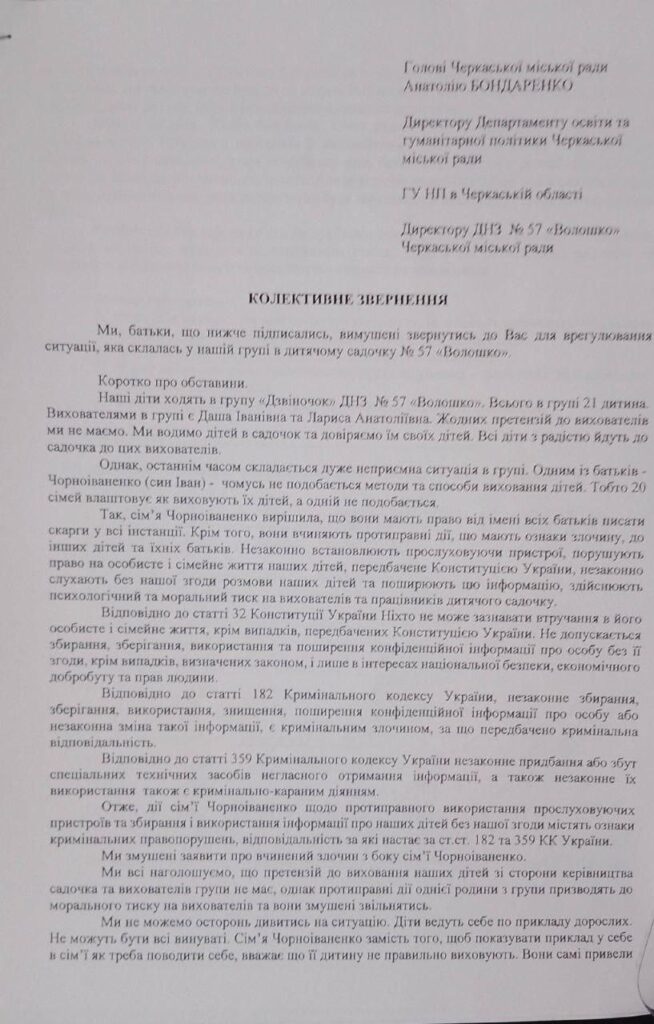 "В садочку 57 не все так просто. Батьки однієї дитини встановлюють незаконно прослуховуючи пристрої, прослуховують дітей, а потім розповсюджують без згоди батьків інформацію про дітей. Батьки просять захистити їх дітей від свавілля однієї людини. Страждають всі діти", - йдеться в дописі.