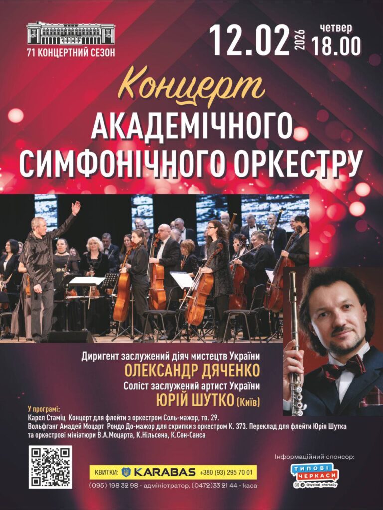 12 лютого у Черкаській обласній філармонії відбудеться унікальний концерт. У тандемі з Академічним симфонічним оркестром під орудою заслуженого діяча мистецтв Олександра Дяченка виступить заслужений артист Юрій Шутко, який єдиний в Україні грає на золотій флейті японської фірми SANKYO і є її обличчям у світі. Як соліст Національної філармонії він прибув із гастролями з Києва до Черкас.