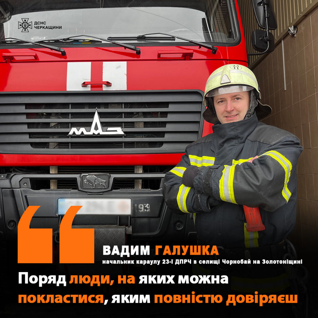 Начальник караулу 23-ї державної пожежно-рятувальної частини у Чорнобаї Вадим Галушка понад десять років рятує життя та ліквідовує надзвичайні ситуації на Золотоніщині. Він переконаний: у його професії головне - швидкість, злагоджена команда та готовність допомогти за будь-яких обставин.