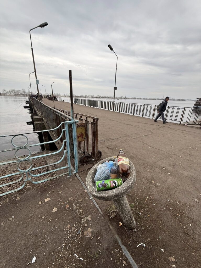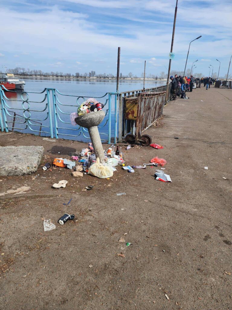 "Мабуть, причиною є те, що значна частина його відвідувачів не вміють там культурно поводитися - їм мало дві урни на пірсі і бак для сміття в 25 кроках (приблизно 15 м) від входу на пірс. Вони сунуть те сміття (пляшки від води, пива, горілки, упаковки від снеків і наживки для риболовлі) і в поручні, і в бювет для води", - розповідає Максюта.