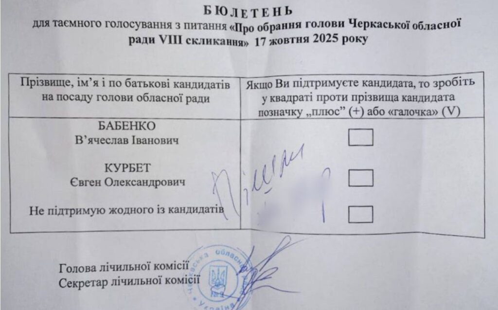 Під час голосування за обрання нового голови Черкаської обласної ради окремі депутати псували бюлетені, писавши на них нецензурні слова.