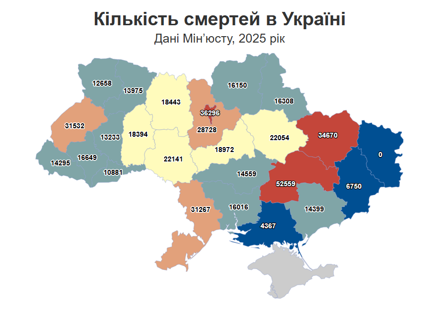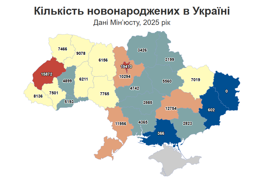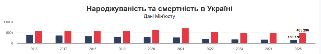 По всій Україні торік народилось 168 778 дітей — на 4,5% менше, ніж у 2024 році, тоді як смертність склала 485 296 випадків, що на 2% менше. Загалом на одного новонародженого припадає троє померлих. Після рекордного падіння народжуваності у 2022 році на 25% її зниження поступово сповільнюється: у 2024 році — на 6%, у 2025 році — на 4,5%.
