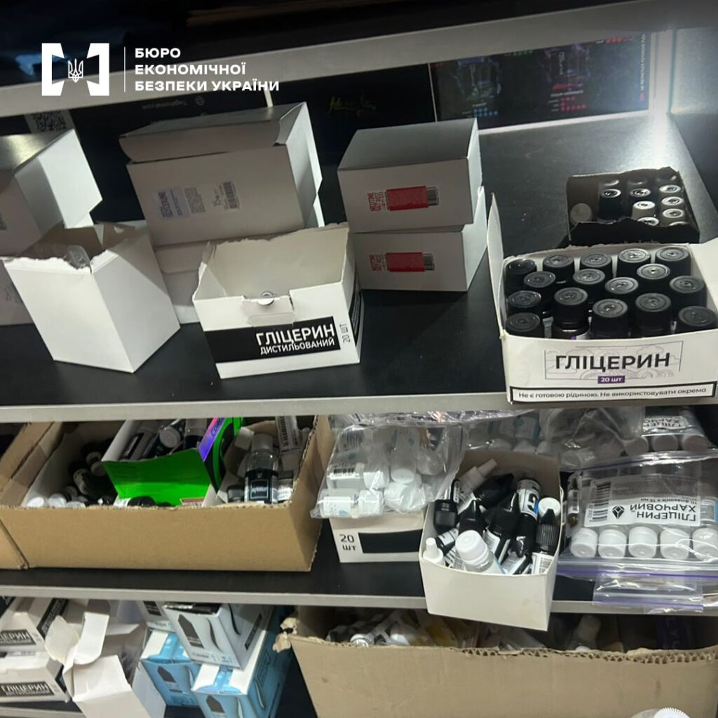 Детективи БЕБ виявили та вилучили понад 15 тисяч ємностей із рідинами для електронних сигарет, POD-системи, картриджі, майже 2 тисячі упаковок тютюну для кальяну та одноразові електронні пристрої. Також знайдено готівку, чорнові записи й комп’ютерну техніку.
