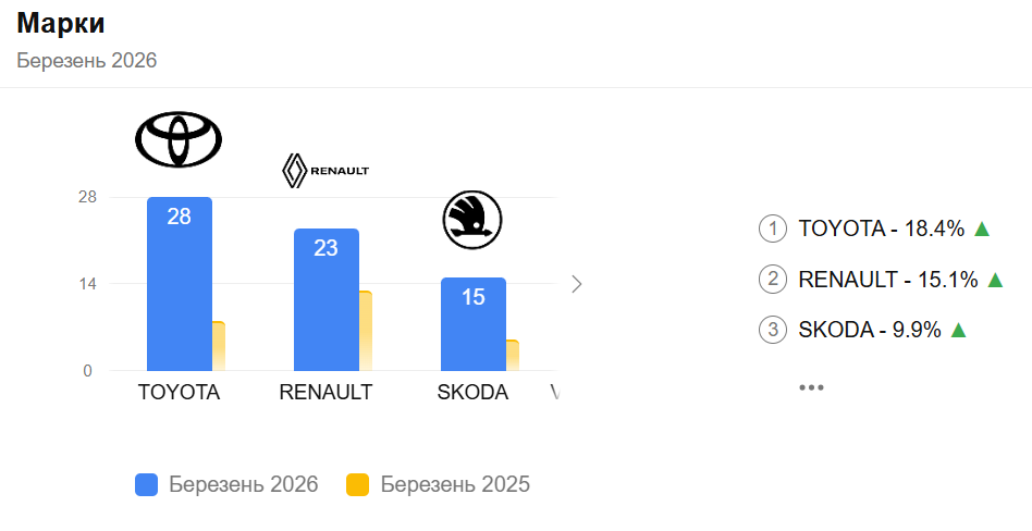 Зростання підтримали ключові бренди. Найбільше реєстрацій отримала Toyota, також зріс попит на Renault, Skoda, BMW, BYD і Citroen.