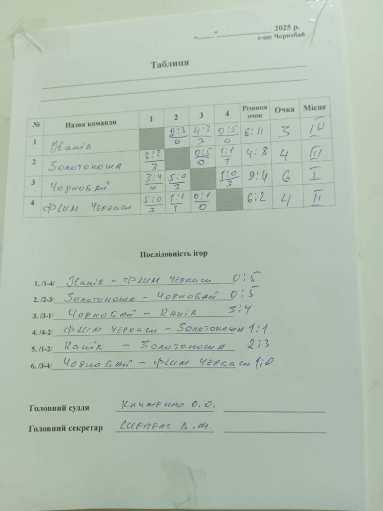 За підсумками турніру перемогу здобули господарі футполя — команда ДЮСШ Чорнобая. Друге місце посіла черкаська команда ФШМ «Явір», яка лише незначно поступилася лідерам. Третє місце вибороли юні футзалісти із Золотоноші. Четверту сходинку турнірної таблиці посіла команда ДЮСШ з Канева.