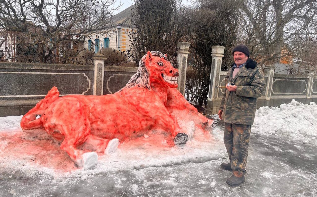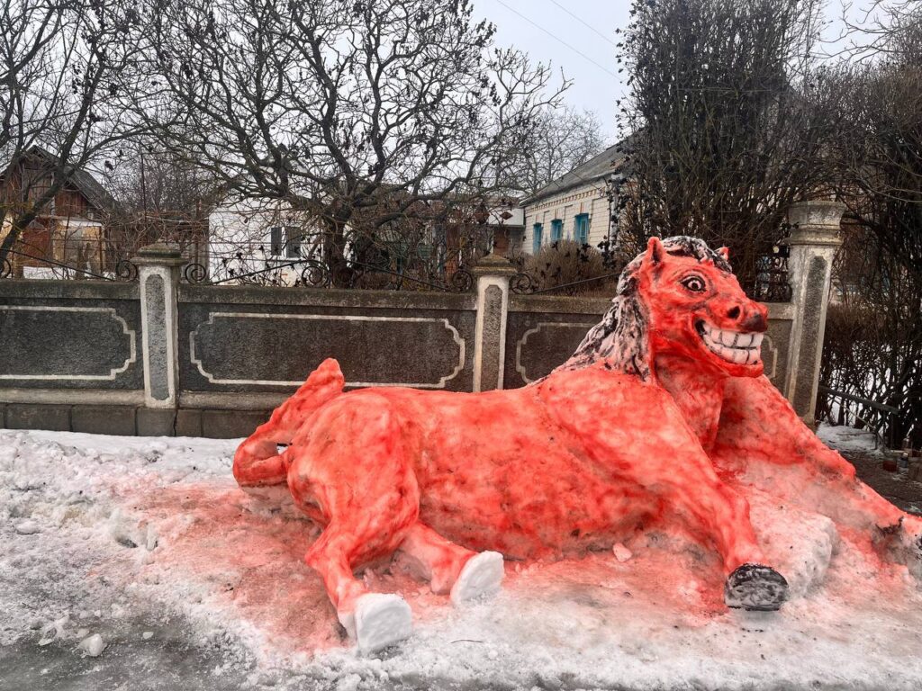 У селі Шевченкове, що на Звенигородщині, місцевий житель Віктор Голуб зі снігу виліпив коня у повний розмір. Скульптуру він розфарбував у червоний колір.