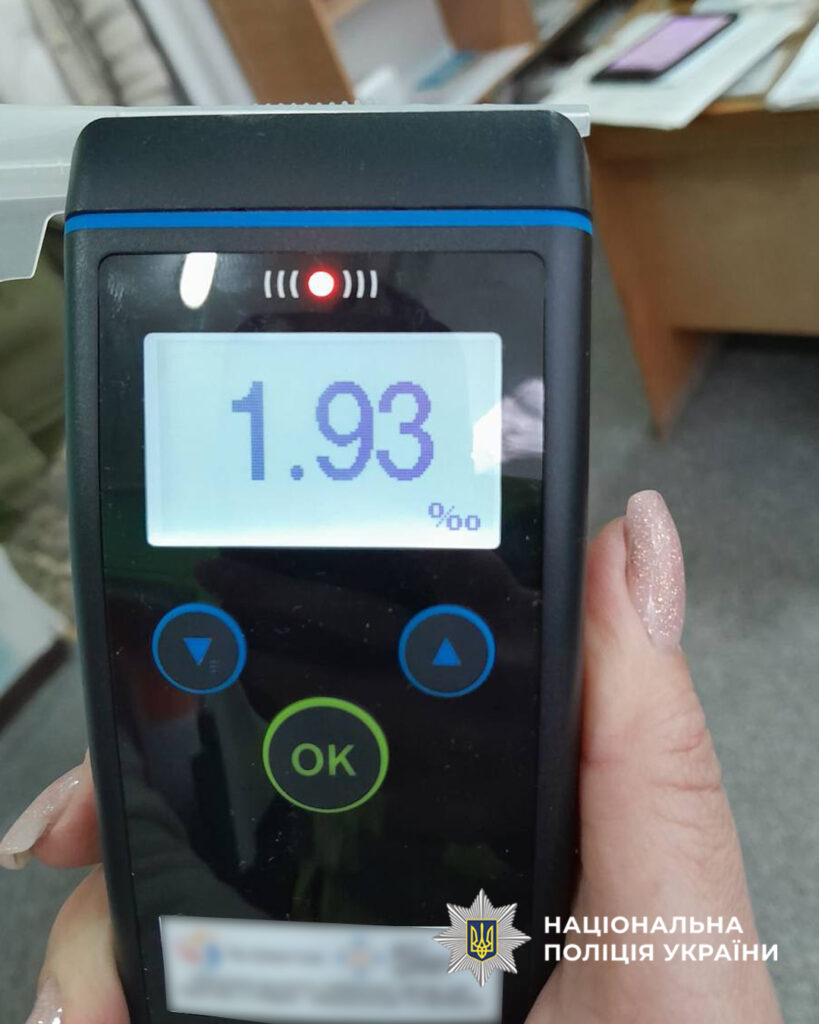 Огляд за допомогою приладу Драгер показав 1,93 проміле алкоголю в крові, що майже у 10 разів перевищує допустиму норму.
