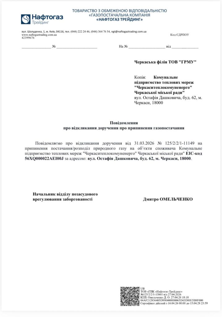 28 квітня «Нафтогаз України» відкликав доручення про припинення газопостачання КПТМ «Черкаситеплокомуненерго».