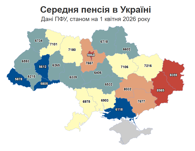 Найвищі пенсії традиційно у Києві - 9 864 гривні, найнижчі на Тернопільщині - 5 612 гривень, на Черкащині - 6 406 гривень.