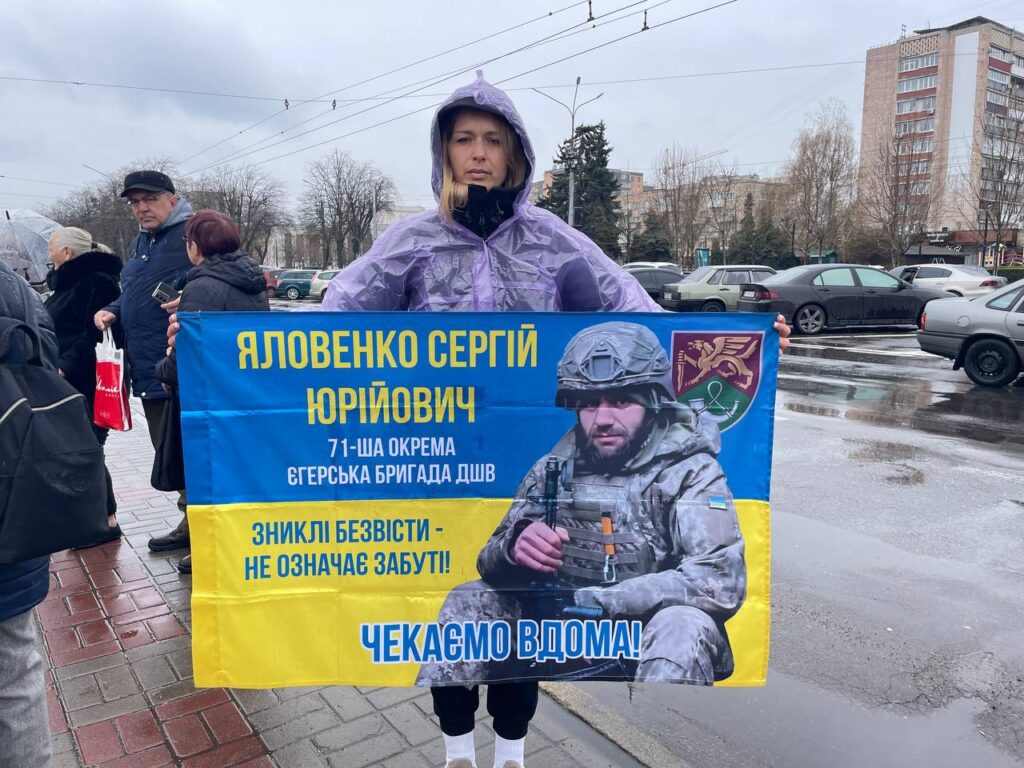 "Мій колишній чоловік, тато моєї доньки — Яловенко Сергій Юрійович, зник безвісти. Служив у 71-й аеромобільній бригаді. Це сталось, коли було влучання дрона по позиції, після цього зв'язок обірвався. Вже рік і три місяці ми нічого не знаємо — повна тиша. Ми приходимо на акції, щоб бути його голосом. Ми дуже його чекаємо, віримо в його повернення. Сьогодні планується обмін, ми також віримо, що будуть гарні новини. Ми тут за кожного, ми чекаємо повернення кожного героя".