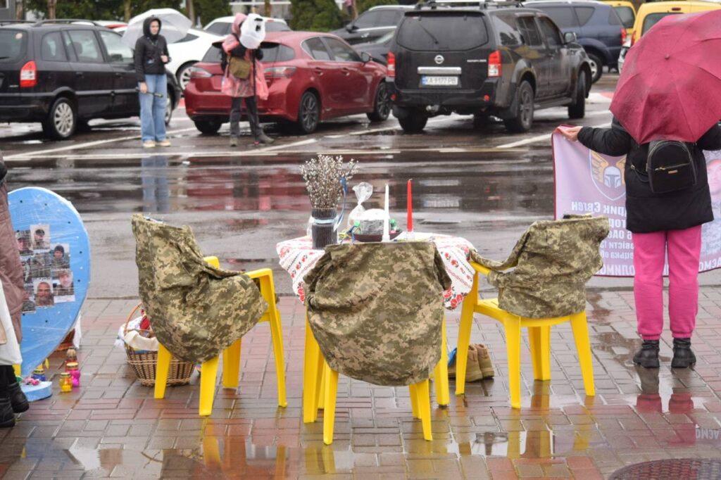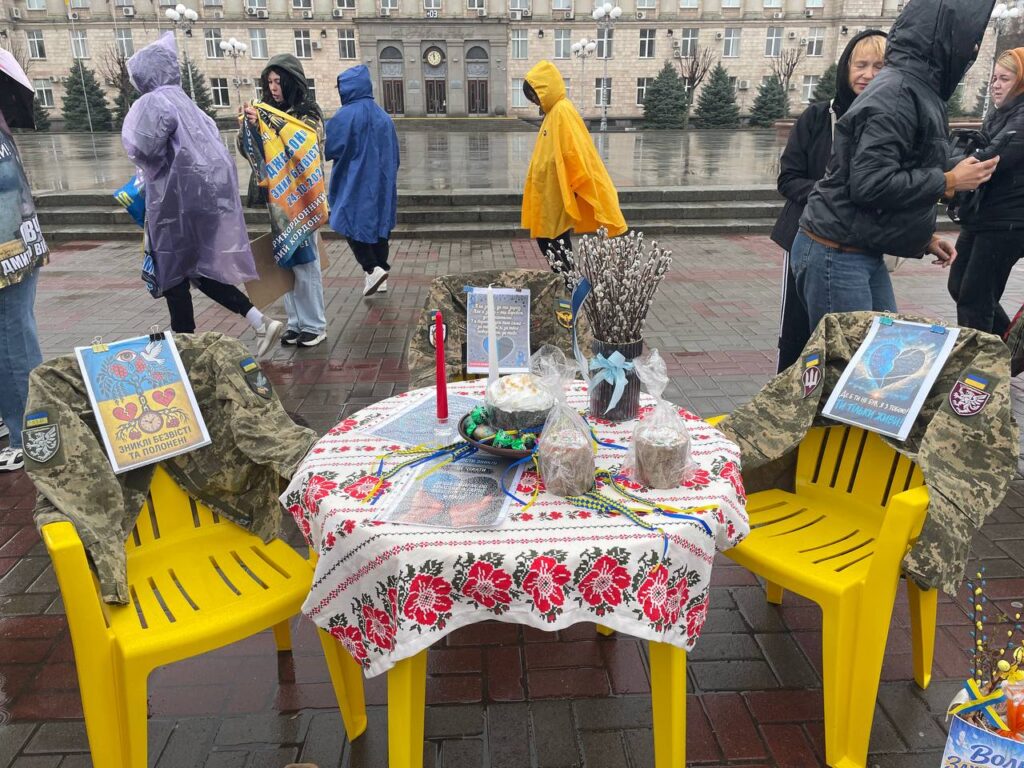 Кошики з пасками, військова форма на стільцях та серце, обклеєне фотографіями зниклих безвісти та тих, хто в полоні — таку інсталяцію підготували на акцію перед Великоднем у Черкасах. На ній зібралися понад пів сотні людей, пише Суспільне.
