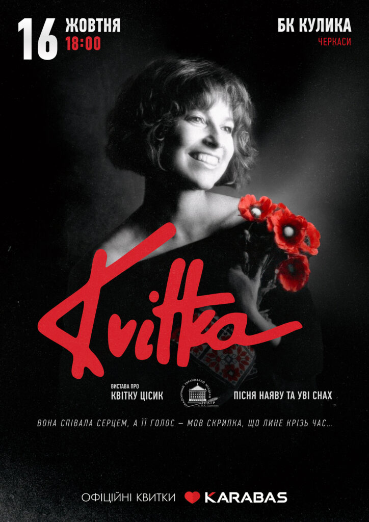 16 жовтня о 18.00 у Черкаському будинку культури ім. Кулика покажуть виставу «KVITKA», що стала світовою прем’єрою — першою у світі постановкою про кохання і долю славетної американської співачки з українським серцем.