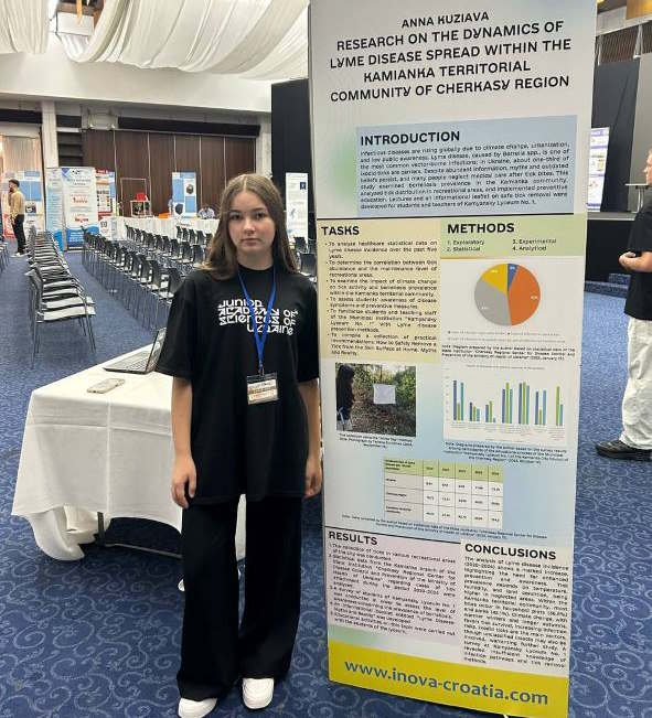 Учениця Кам’янського ліцею №1 виборола перемогу за проєкт «Дослідження динаміки поширення хвороби Лайма в межах Кам’янської територіальної громади Черкаської області». Її наукові керівники — Тетяна Сірченко та Тетяна Шамрай.