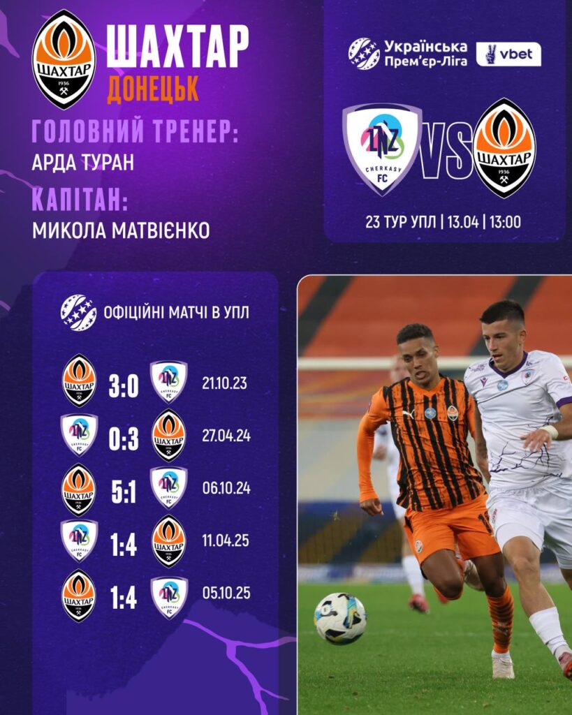 13 квітня черкаський ФК "ЛНЗ" у 23 турі УПЛ зіграє з донецьким "Шахтарем". "Фіолетові" гратимуть вдома на "Черкаси-арені", матч розпочнеться о 13.00.
