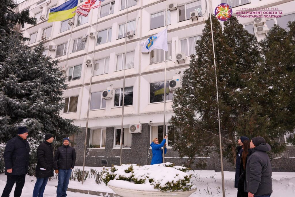 На площі біля Черкаської міської ради підняли олімпійський прапор з нагоди відкриття XXV зимових Олімпійських ігор.