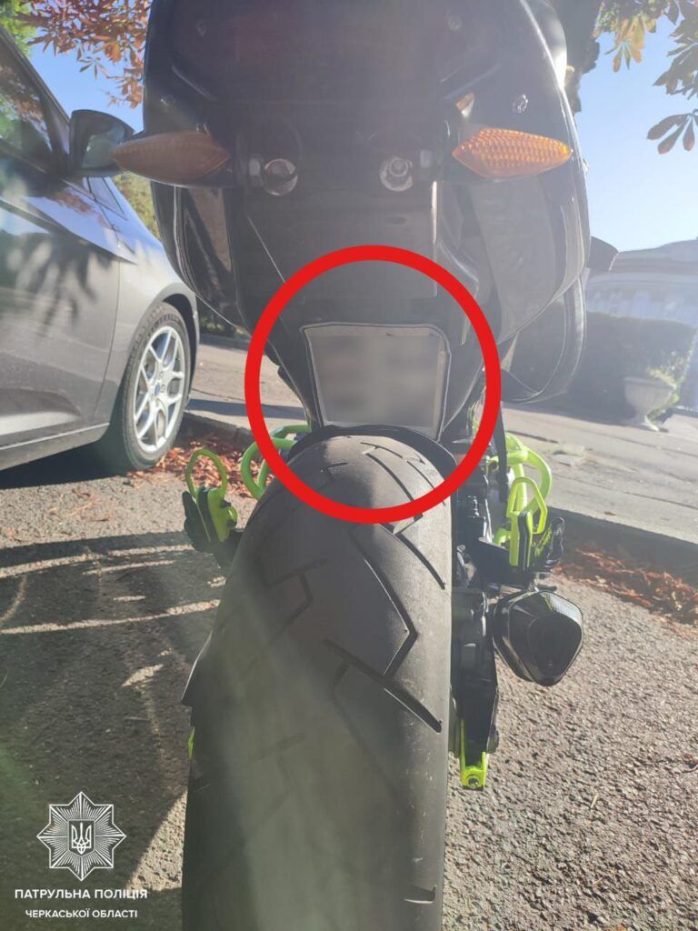 У Черкасах патрульні зупинили водія мотоцикла Honda Hornet за порушення правил використання номерних знаків, що ускладнювало ідентифікацію. Порушення зафіксували вчора, 11 вересня.
