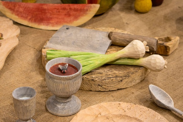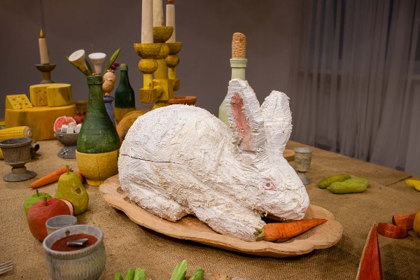 У центрі столу розміщена фігура кроля — персонажа, який не є учасником бенкету. Він не став їжею, але й не є вільним. Його образ спокійний зовні, проте наповнений закладеним у форму постійним відчуттям страху. Поруч — тесак, звичайний утилітарний предмет, який у цьому контексті стає знаком небезпеки.