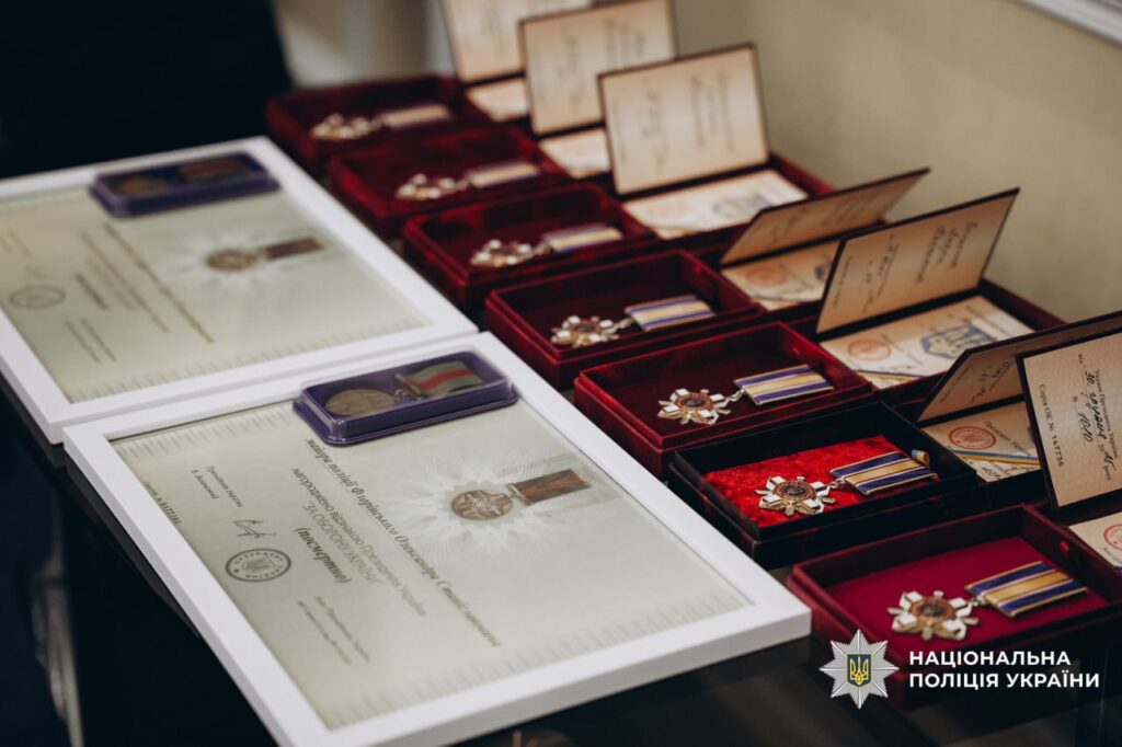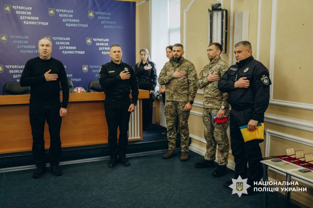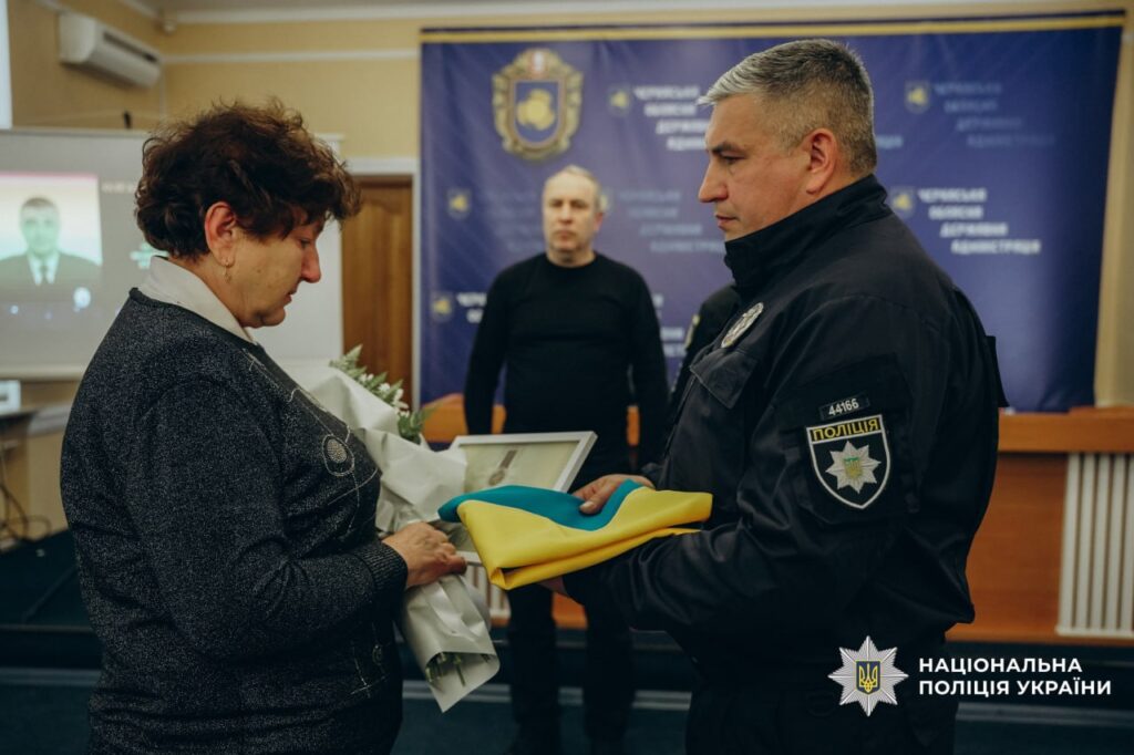 У Черкаській обласній військовій адміністрації родинам загиблих поліцейських передали державні нагороди та бойові прапори. Їх вручали голова Черкаської ОВА Ігор Табурець та начальник ГУНП в Черкаській області Ярослав Меженний, висловлюючи слова вдячності та підтримки рідним загиблих правоохоронців.