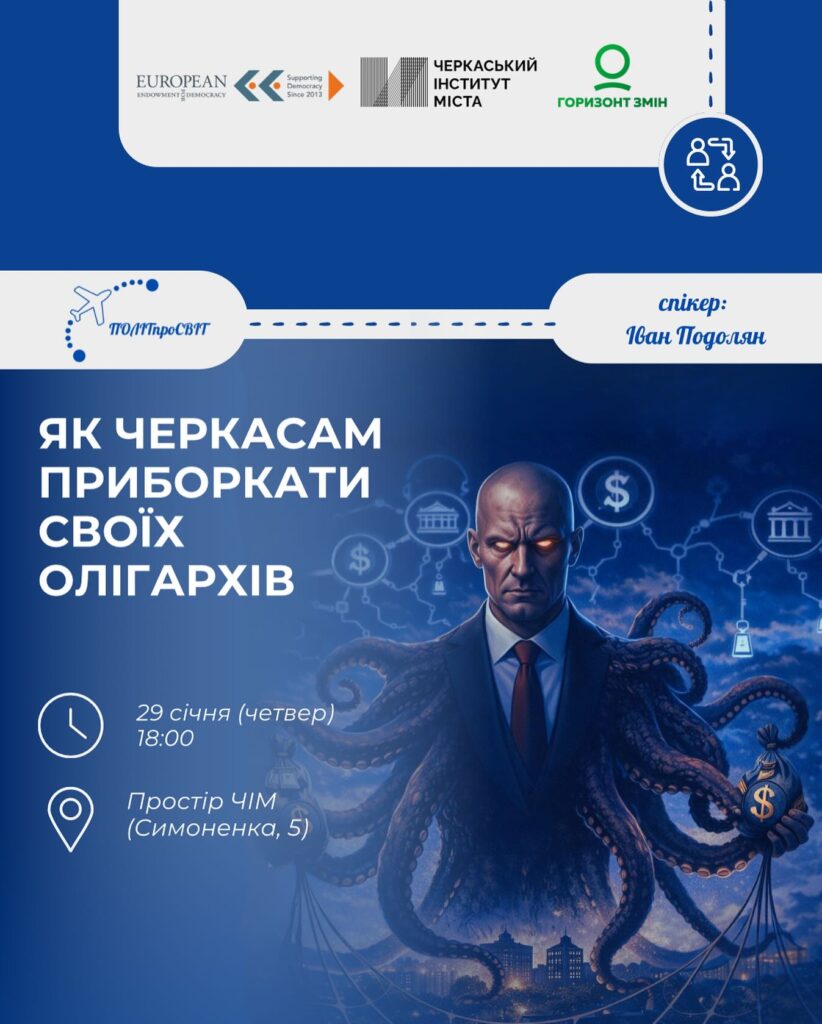 Завтра, 29 січня, жителів Черкас запрошують на чергову лекцію проєкту «ПОЛІТпроСВІТ» на тему «Як Черкасам приборкати своїх олігархів». Захід безоплатний і відбудеться у просторі Черкаського інституту міста. Про це повідомляють організатори події - громадські організації «Черкаський інститут міста» та «Горизонт змін».