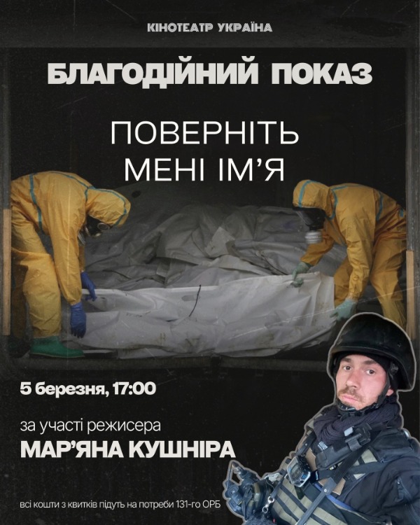 Благодійний спеціальний показ документальної стрічки "Поверніть мені ім'я" за участі режисера Мар'яна Кушніра відбудеться у кінотеатрі "Україна" у четвер, 5 березня.