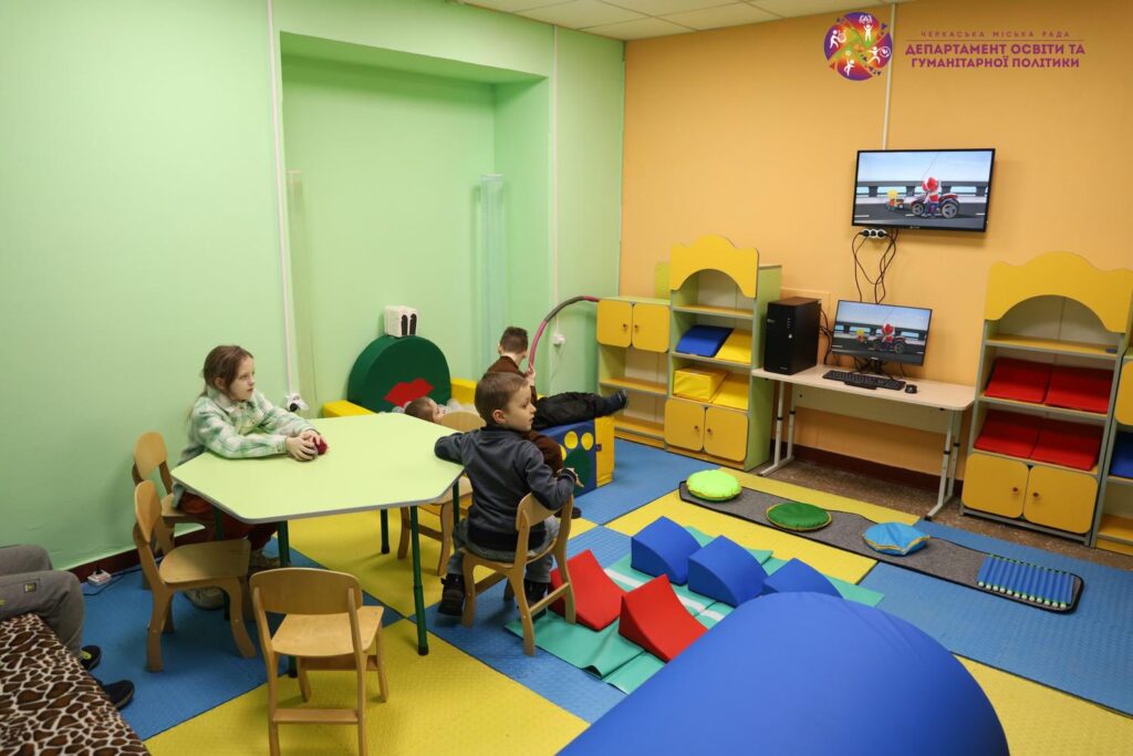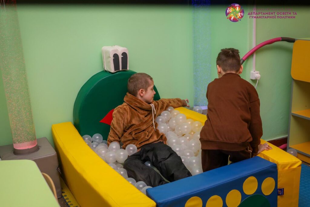 Простір поділено на ігрову, навчальну та сенсорну зони. Кімната оснащена сучасним обладнанням, зокрема партами та комп’ютером для навчальної роботи, а також сенсорним обладнанням: бульбашковими колонами, тактильними м’ячиками, тунелями, реабілітаційним конструктором та сухим басейном.