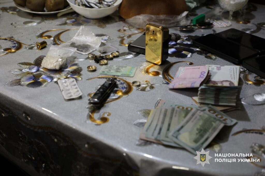 Під час обшуків у помешканнях фігурантів правоохоронці вилучили речовину, схожу на амфетамін, 1 000 доларів та 89 000 гривень, пакувальні матеріали, електронні ваги з нашаруваннями та інші речові докази. Вилучене направлено на експертизу.
