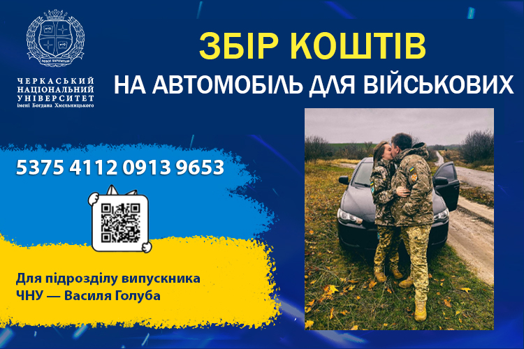 Черкаський національний університет імені Богдана Хмельницького оголосив терміновий збір для підтримки Сил оборони України. Випускник ННІ інформаційних та освітніх технологій і кафедри військової підготовки Василь Голуб просить допомогти придбати автомобіль для свого підрозділу.
