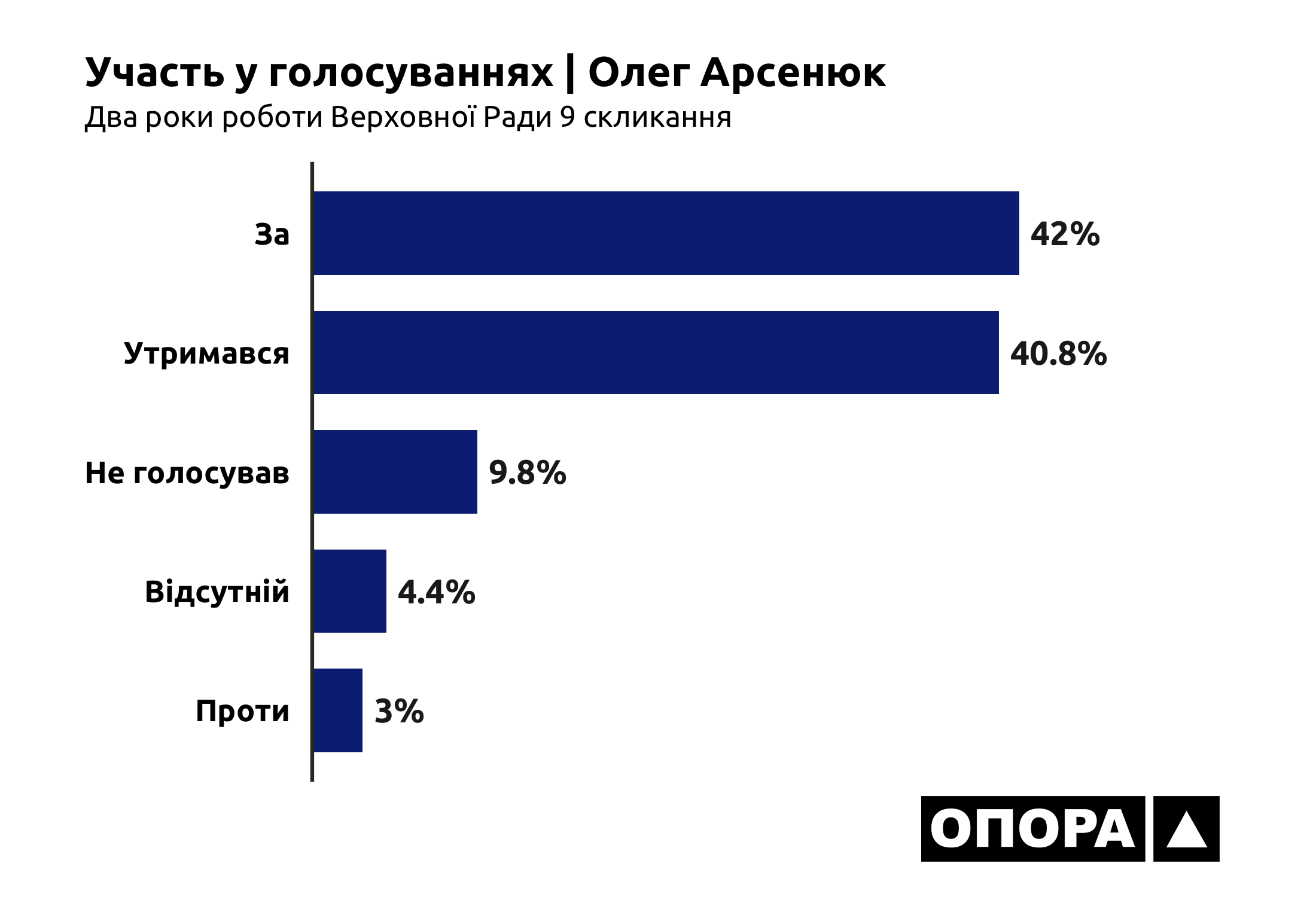 Найменше голосувань (4,4%) пропустив представник 195 ОВО із центром у Соснівському районі м. Черкаси, член фракції “Слуга Народу” Олег Арсенюк. Разом із тим він частіше за інших своїх колег із регіону голосував “за” – у 42% випадків. Під час 40,8% голосувань Олег Арсенюк утримувався, під час 9,8% – не голосував і під час 3% був проти.