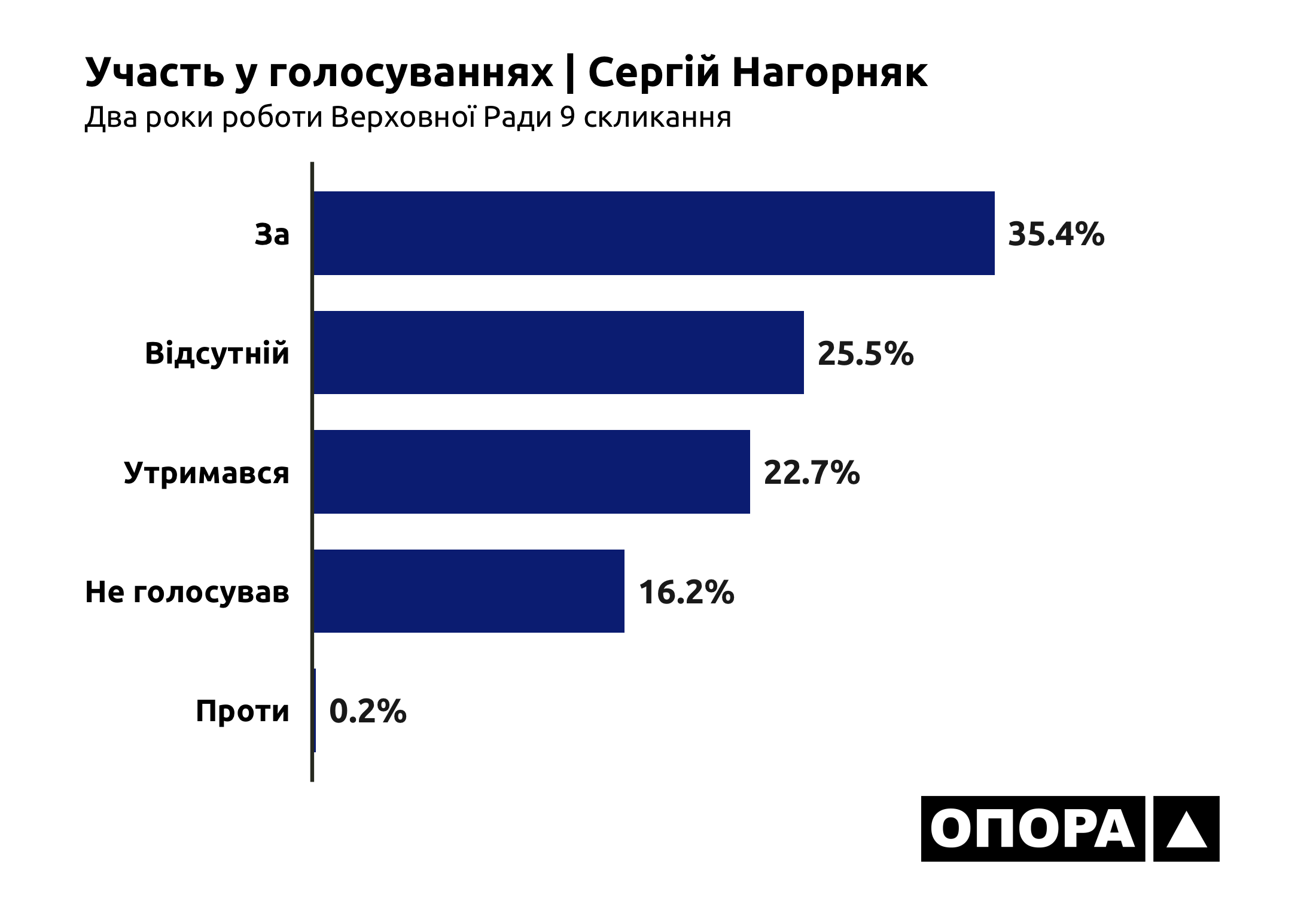 Представник округу №196 із центром у місті Корсунь-Шевченківський, член фракції “Слуга Народу” Сергій Нагорняк пропустив 25,5% голосувань. У 35,4% випадків депутат голосував “за”, у 22,7% – утримувався, 16,2% голосувань проігнорував будучи в залі і у 0,2% випадків голосував проти.
