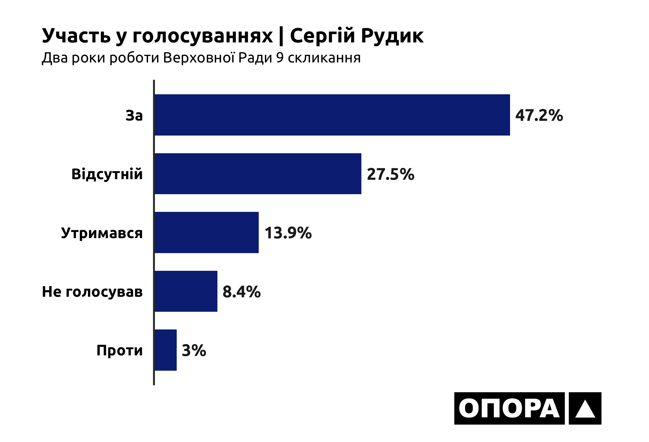 27,5% голосувань пропустив мажоритарник від 198 ОВО із центром у місті Сміла, представник депутатської групи “Партія “За майбутнє” Сергій Рудик. Під час 47,2% голосувань він тис кнопку “за”, у 13,9% випадків утримувався, у 8,4% – не голосував будучи присутнім і під час 3% голосувань був проти.