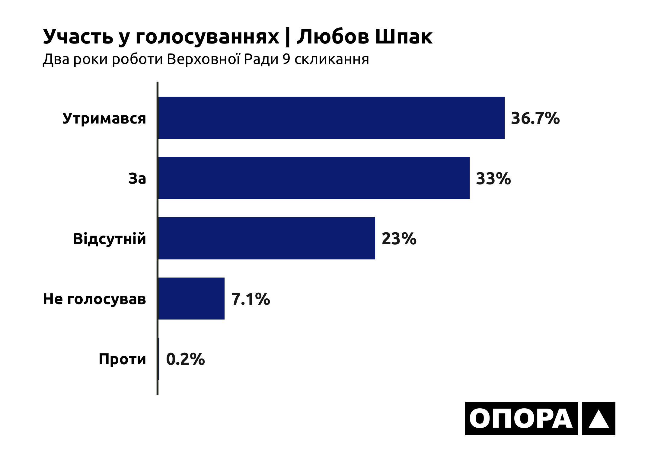 Мажоритарниця від 194 виборчого округу із центром у Придніпровському районі м. Черкаси, представниця фракції “Слуга Народу” Любов Шпак була відсутня під час 23% голосувань. У 36,7% випадків вона утримувалась, у 33% тисла кнопку “за”, 7,1% голосувань проігнорувала будучи в залі і в 0,2% випадків голосувала проти.