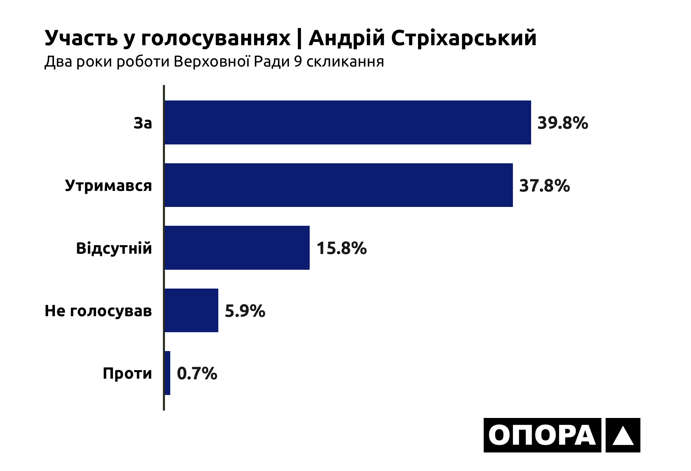 Депутат від округу №199 із центром у місті Жашків, представник фракції “Слуга Народу” Андрій Стріхарський пропустив 15,8% голосувань. У 39,8% він голосував “за”, у 37,8% – утримався, не голосував будучи в залі під час 5,9% голосувань і під час 0,7% був проти.