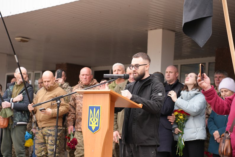 "Бойового шляху разом з Сергієм Русіновим у мене немає, але в нашій громаді є побратими, які разом з ним захищали честь та гідність нашої нації. Ми приїхали сюди всією нашою організацією підтримати та вшанувати пам'ять Сергія Русінова. Він справді випправдовує свій позивний — «Шаман». Це людина, яка була неймовірно правильна, старовір, людина, яка ментально розуміла всіх побратимів. Зараз душа нашої спільноти, наш ментальний командир на тому світі".